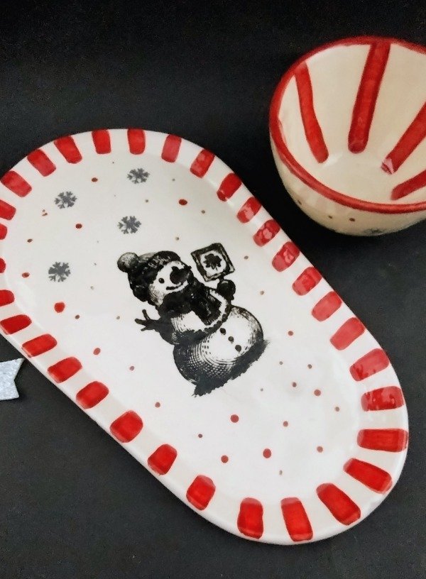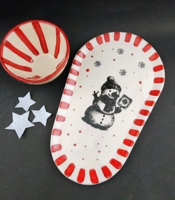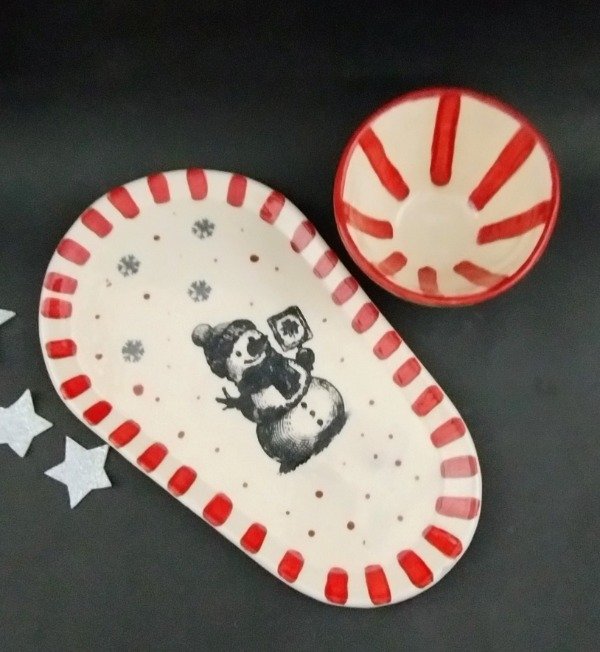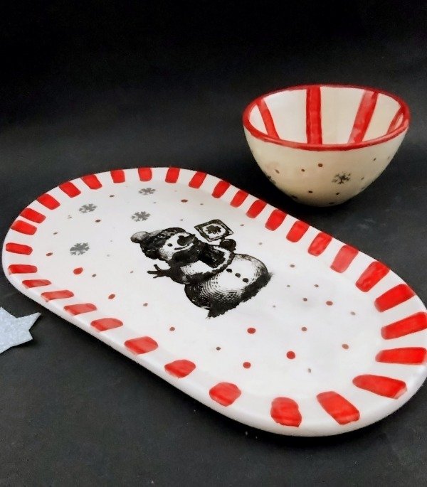Bandeja y cuenco de cerámica, elaboración propia, decorado con la técnica de serigrafía en bajo cubierta.